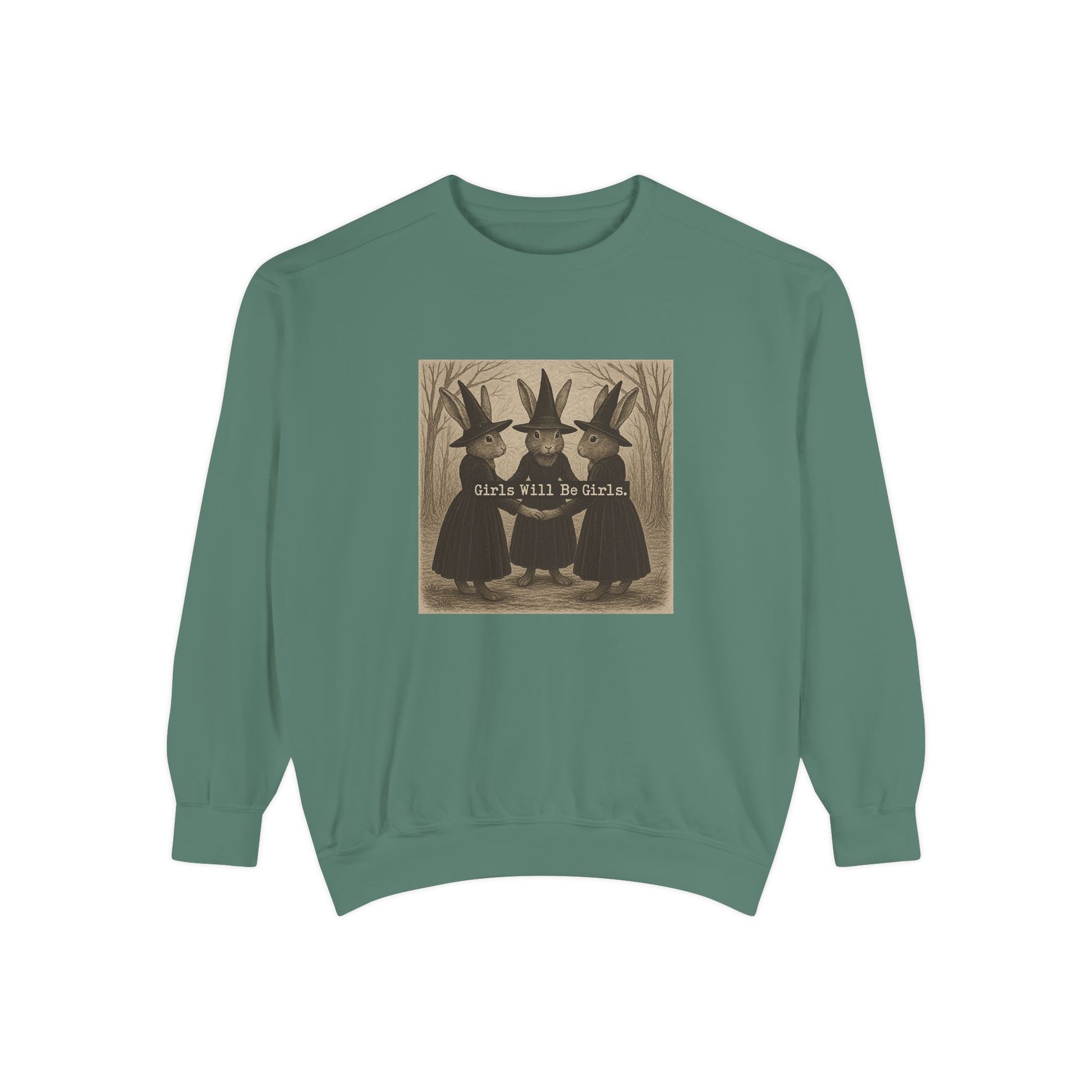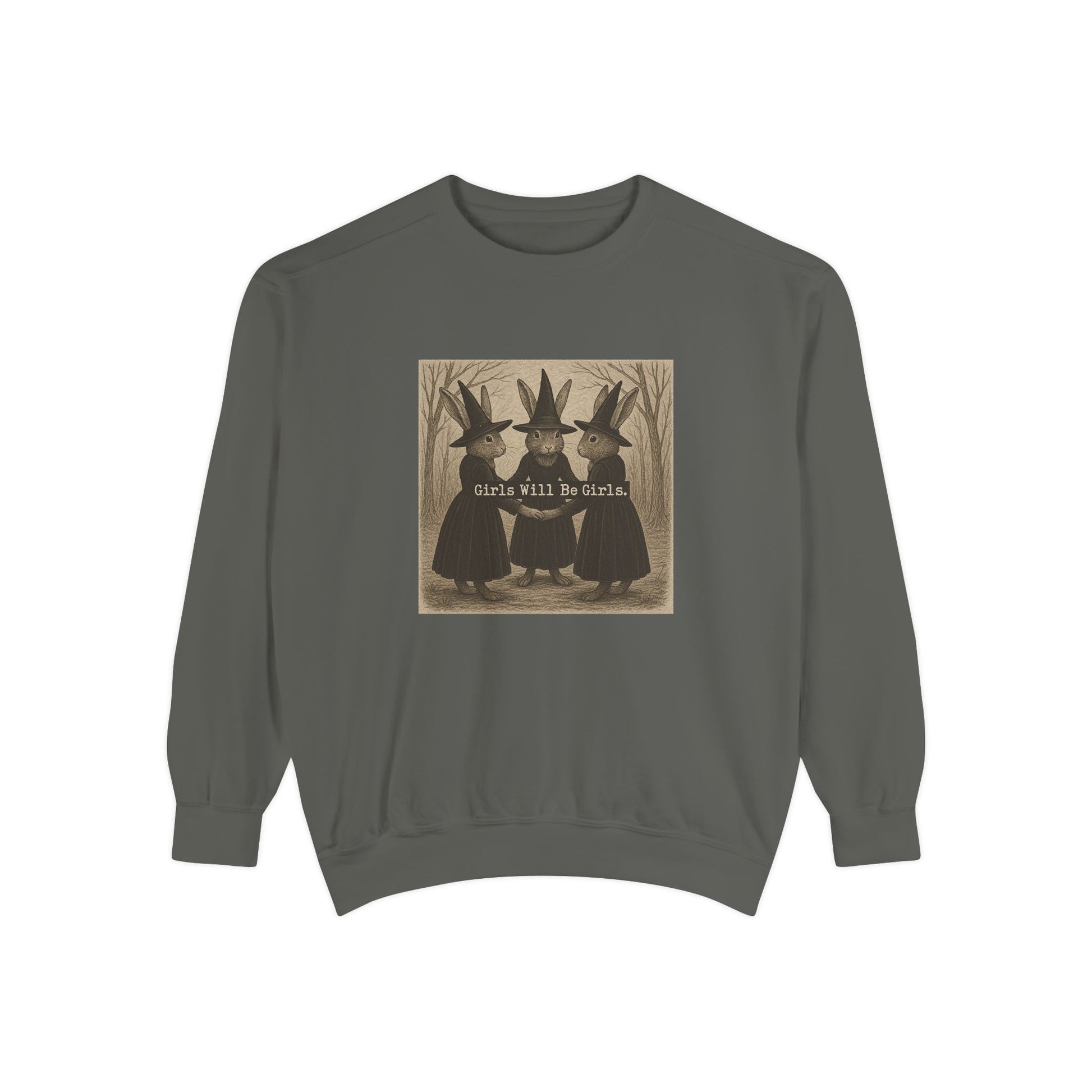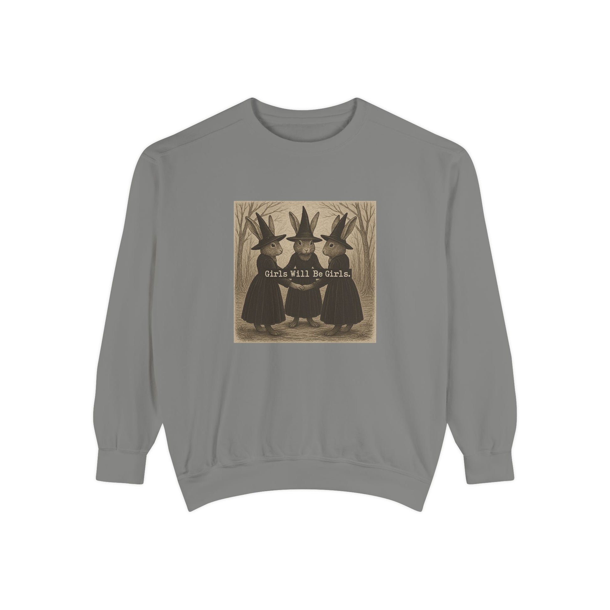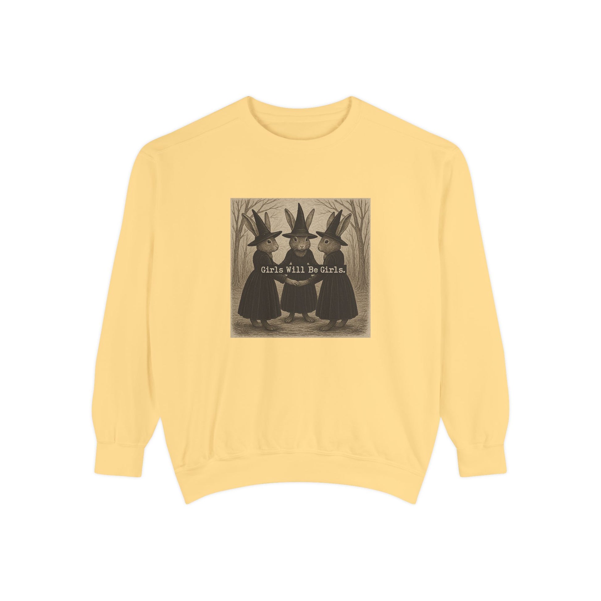 Girls Will Be Girls Rabbit Witch Circle – Garment-Dyed Bunny Sweatshirt | Halloween & Fall Collection