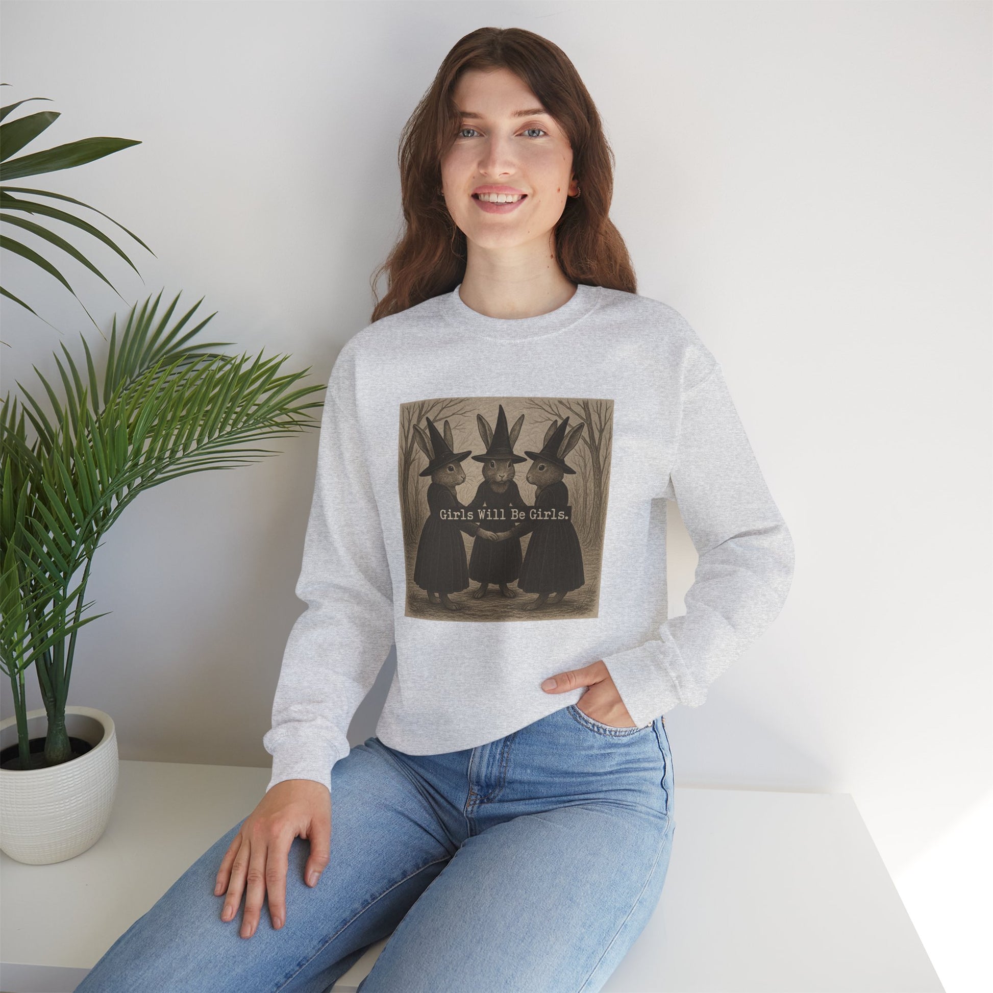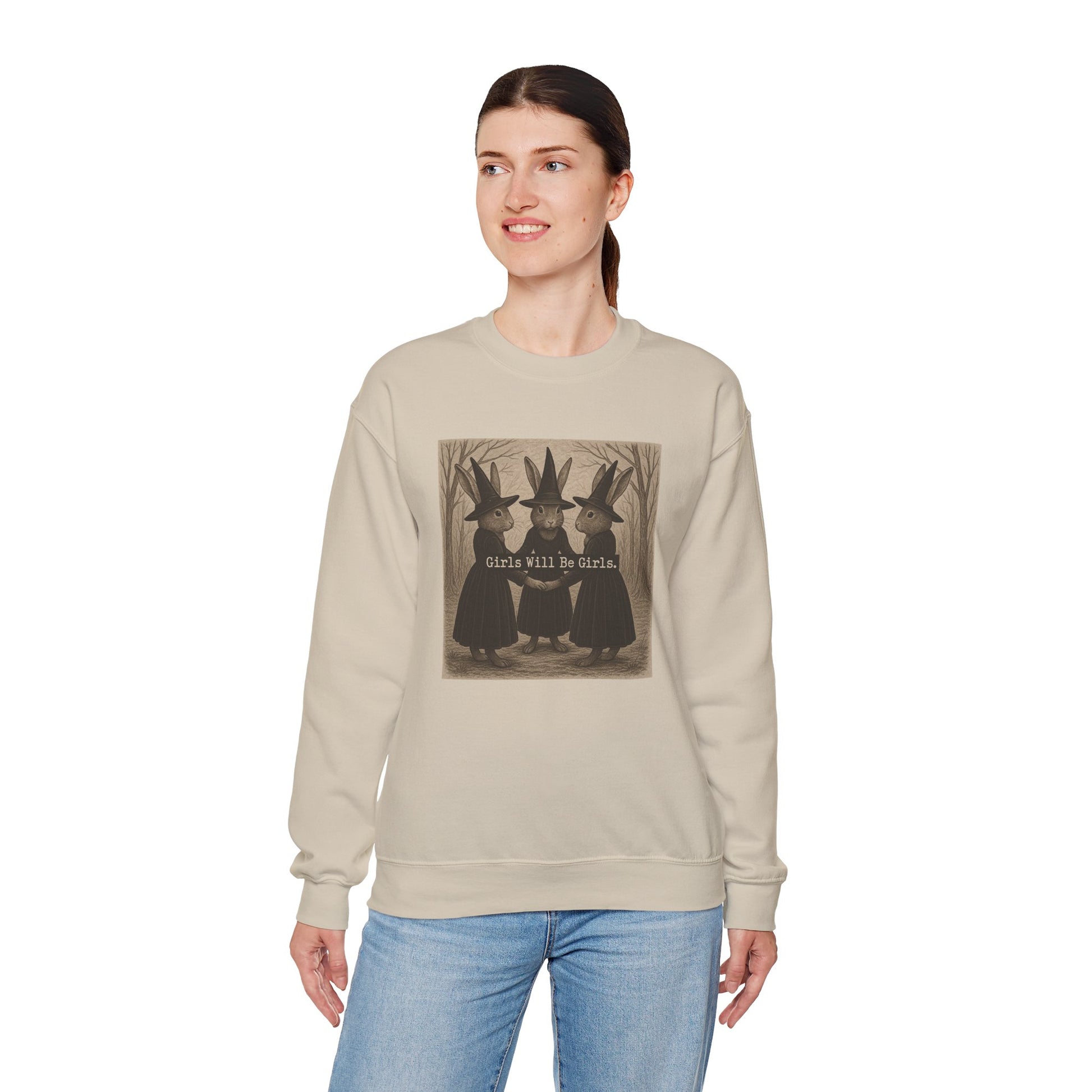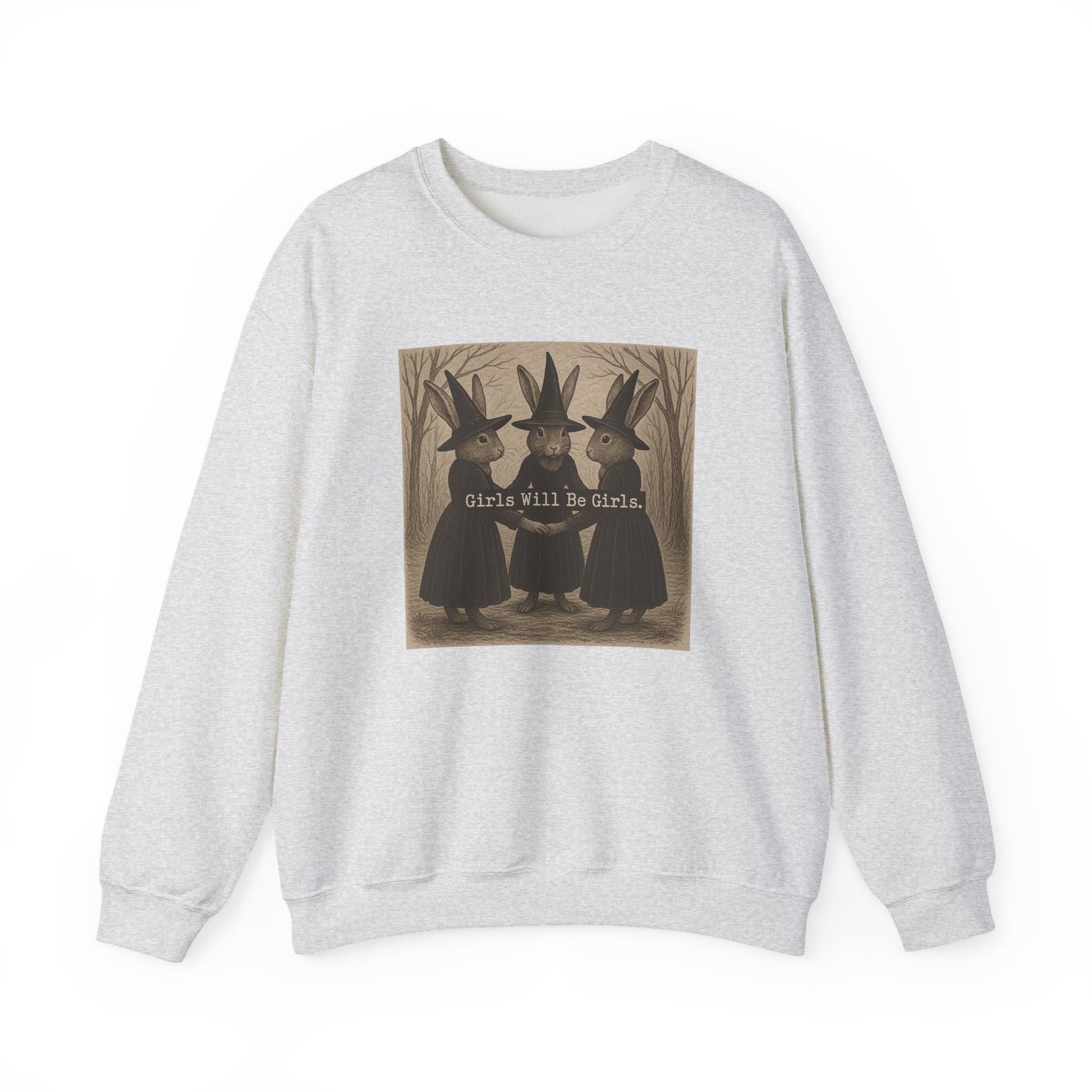 Girls Will Be Girls – Witchy Rabbit Crewneck Sweatshirt | Cozy Whimsical Rabbit Sweatshirt for Girls & Women - Halloween & Fall Collection