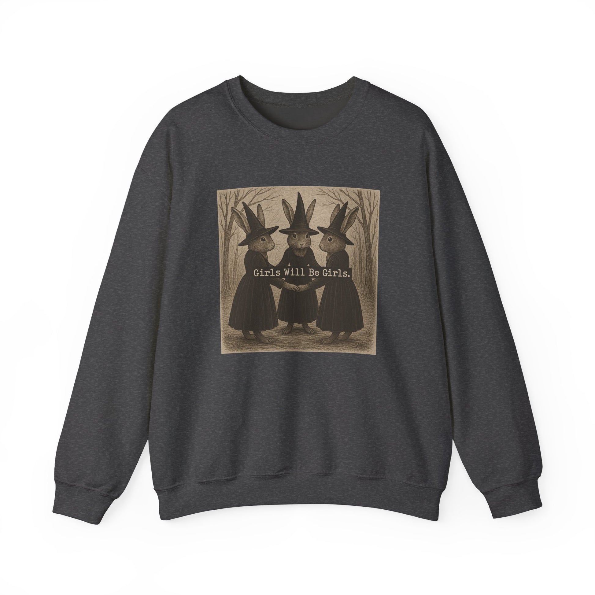 Step into the circle, Bunthusiast—because this sweatshirt brings the perfect blend of witchy charm and rabbit whimsy. Our “Girls Will Be Girls” design features three enchanting rabbits dressed in classic witch hats and dresses, holding paws in a spellbinding woodland scene. It’s equal parts mysterious, trendy, and tongue-in-cheek—just the way fall fashion should be.